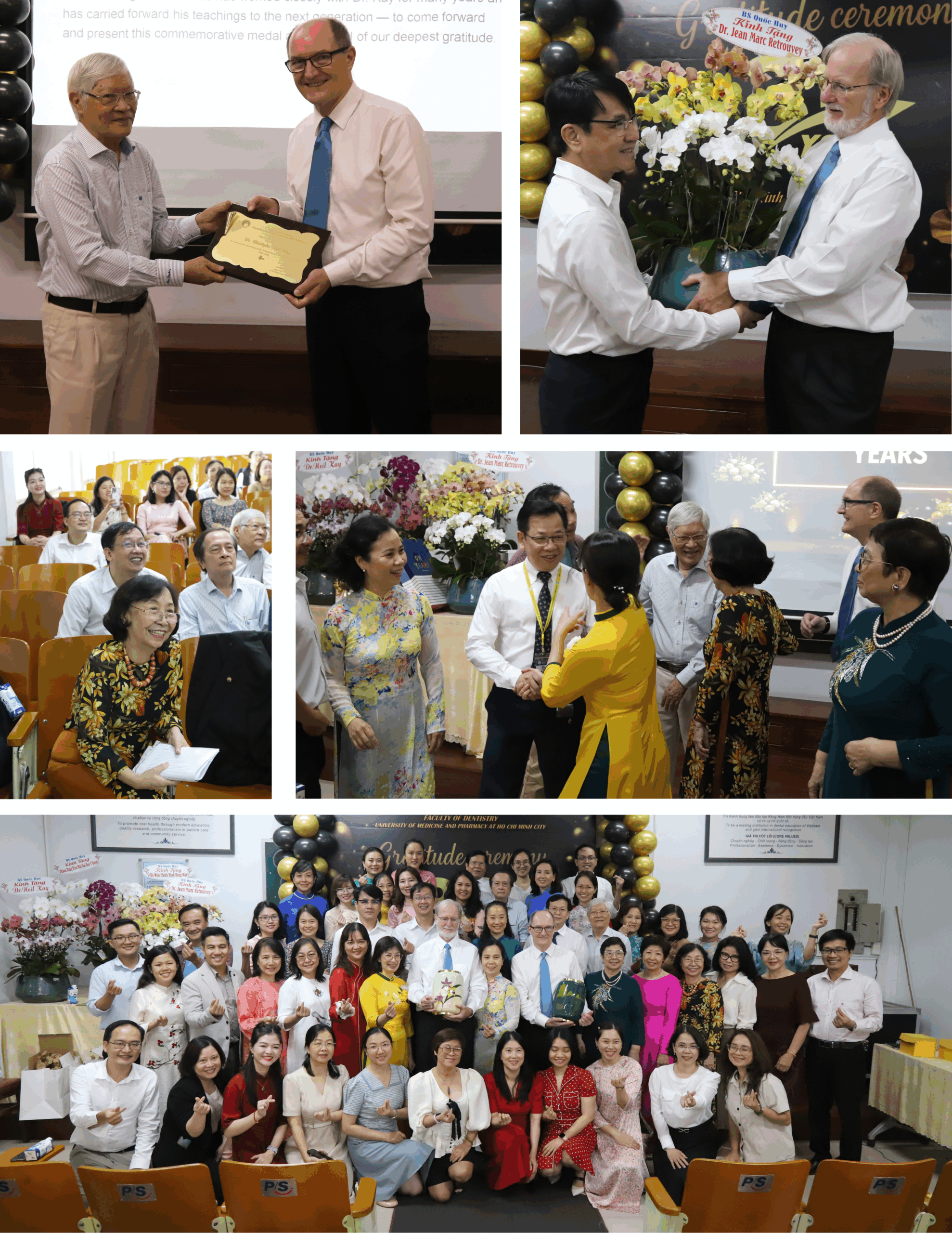 The University of Medicine and Pharmacy held a gathering in early 2025 to honor Dr. Kay and Dr. Retrouvey. “At the meeting, they told us that without our teaching they would not be where they are now,” said Dr. Kay. “It took me by surprise. They did this as a thank you to us.” Over one hundred former students and faculty came from all over to see Dr. Kay and Dr. Retrouvey and thank them in person.