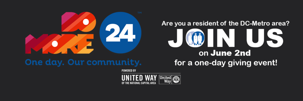 Twitter Join UsFortunately, we will have that opportunity this Thursday, June 2nd when we join United Way of the National Capital Area and Global Impact for a one-day, community-based giving event.  Do More 24 is a local movement that brings together nonprofit organizations, companies, and people committed to making a difference. Through focused online giving on June 2, 2016, Do More 24 provides the opportunity for people in the D.C. metro area to give to the causes and organizations closest to their hearts .
