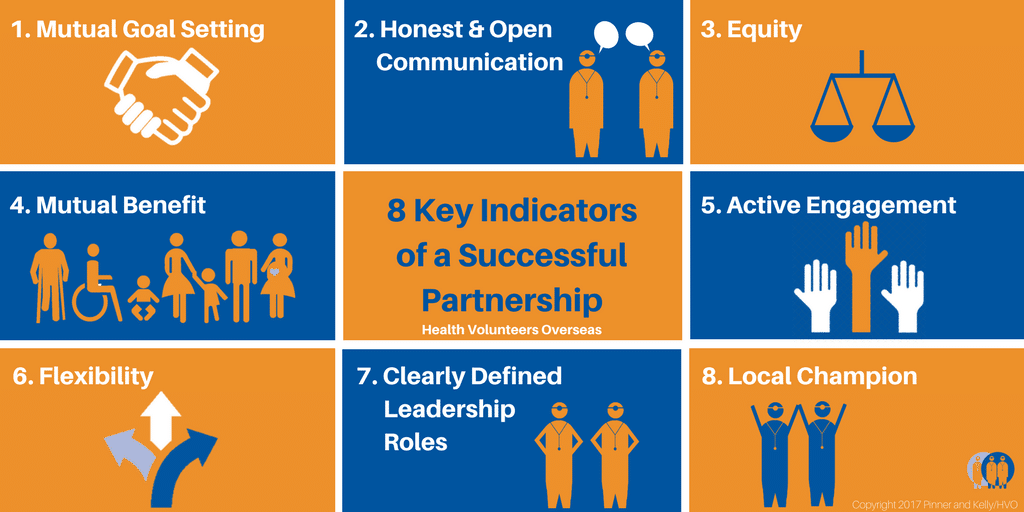 In Health Volunteers Overseas: 30 Years of Leveraging International Partnerships to Strengthen Health Worker Capacity, Pinner and Kelly identify key indicators of successful international partnerships in education and health worker capacity building: