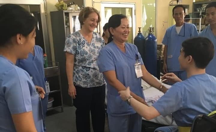 We met as student and faculty member at Jefferson University in the eighties. I got involved with HVO in 1994 as a participant in the Vietnam rehabilitation project funded by USAID. I have been to several sites in Vietnam, starting with the rehab project and then several individual nursing projects. I did some work in Cambodia, starting that relationship with HVO and then filling in as a temporary project director. Patty applied to volunteer there and we realized our past connection. She was a good fit and definitely made some inroads there. Immediately, I thought she would be an excellent project director and suggested her for the role. She has not disappointed me in this venture! Her ideas and subsequent activities with the Cambodian nurses continue to improve the project. I feel so proud of her and the fact that she is continuing work that is so meaningful to me.